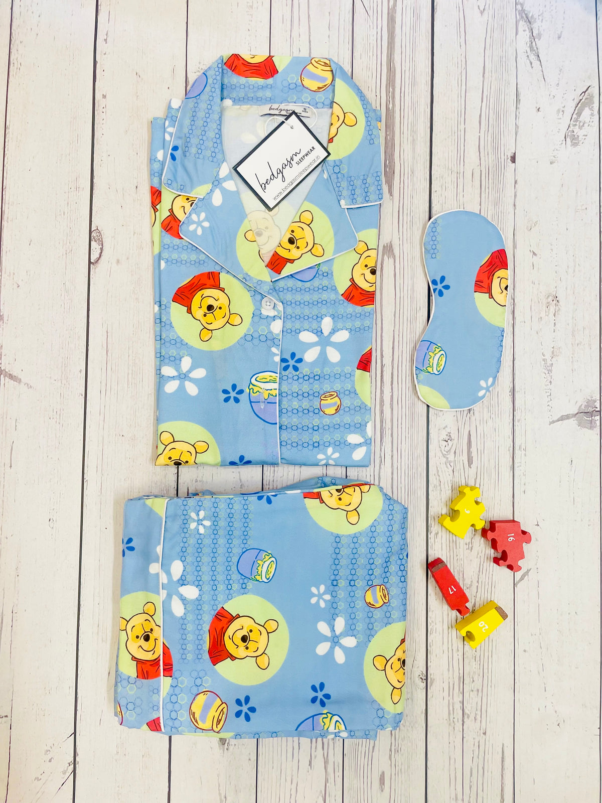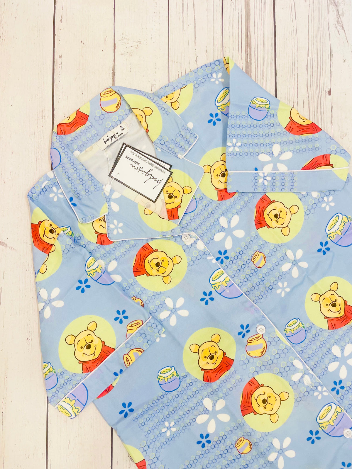 Indulge in the charming comfort of the "Honey Poo! Women's Nightwear Set," a dreamy addition to any bedtime routine. This delightful set is lovingly crafted from a soft cotton blend fabric, ensuring night-long comfort and softness. Adorned with an endearing bear character and honey pot motifs amid a field of white daisies, the design is set against a tranquil blue background, creating a peaceful bedtime ambiance.