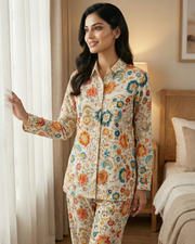 Indulge in the splendor of The Maharani Lounge Edit, where imperial charm meets cloud-like comfort. This distinct women's nightwear set is tailored from pure, breathable 100% cotton, ensuring a soft touch that soothes the senses after a long day. The design features a sophisticated classic collar and a mesmerizing botanical print—a rich tapestry of deep teals, antique golds, and vibrant reds that evoke the timeless beauty of royal Indian gardens.