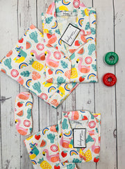 Sleepwear, a charming twinning collection for mothers and their little ones. Adorned with a playful mix of summer icons, including pink flamingos, bright pineapples, and sweet strawberries, interspersed with cool cacti and magical rainbows, this set encapsulates the joy of sunny days. The Summer Breeze Pajama Set comes with a comfortable, button-up top and easy-fit pants, both featuring a cheerful array of summertime symbols set against a crisp white background. The lightweight fabric ensures breathability and a soft touch, making these pajamas a perfect choice for warm nights or lazy weekend mornings. This delightful mother and kid set is as practical as it is cute, with a relaxed fit for moms and a cozy but sturdy make for kids. It's an ideal way to make bedtime fun, encourage imaginative dreams, and enjoy precious moments of matching style. Whether it's for enjoying breakfast together or a cozy bedtime story, the 'Summer Breeze Pajama Set Nightwear Set' from Bedgasm Sleepwear infuses a sense of seasonal fun into your sleepwear routine.