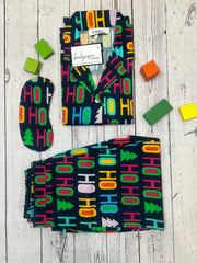 Step into the festive season with our Ho Ho Ho Kids Nightwear Set, designed to sprinkle a touch of joy and color into bedtime routines. This set is a holiday favorite, featuring a dynamic array of 'Ho Ho Ho' text in a playful font, interspersed with classic Christmas trees that capture the spirit of the season. This merry ensemble includes a comfortable top and a pair of pants, both enveloped in a cheerful Christmas-themed print against a dark backdrop to highlight the vivid colors. Made from a soft, breathable fabric, this set ensures a warm and snug fit for all-night comfort. The elasticated waistband on the pants ensures a good fit, while the ribbed cuffs at the wrists and ankles keep the cold out and the festive warmth in. The Ho Ho Ho Kids Nightwear Set is the perfect choice for the little ones to wear while waiting for Santa, opening presents, or enjoying family festivities. It's an ideal gift for the holiday season, offering both style and comfort. This sleepwear is not just about celebrating the most wonderful time of the year; it's also about providing durable, easy-to-care-for quality that can survive the excitement of the holiday season and beyond.