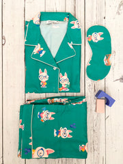 The vibrant teal color, a canvas for Luna’s endearing spectacles and playful antics, ignites the imagination, promising a journey to dreamland that’s as fun as it is restful. With a whimsy that tickles the fancy and comforts that cuddle, this nightwear set is designed for the dreamers, the thinkers, the young readers, and the midnight snackers.