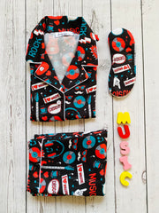 Hit the snooze in style with the 'Time To Disco Kids Nightwear Set' from Bedgasm Sleepwear – a funky, retro-inspired sleep set that's sure to be a hit at every sleepover! This groovy ensemble features bold graphics of vinyl records, classic cassette tapes, and vibrant "I Love Music" slogans, creating a lively tribute to the disco era, tailored just for the little music enthusiasts. Each set comes with a comfy, full-sleeved top and matching pants, both adorned with a lively mix of red and turquoise highlights that pop against the jet-black fabric. The nightwear set is not just a feast for the eyes; it's also a haven of comfort, made from soft, breathable materials that ensure your child's all-night comfort and uninterrupted dreams of dance parties under disco balls. Tailored for the young and the restless, the 'Time To Disco Kids Nightwear Set' is crafted for durability and ease of care. The snug fit with banded cuffs keeps the nightwear in place, making it perfect for everything from bedtime grooving to lazy weekend lounging. And when it's time to clean up, just toss it in the wash for hassle-free maintenance. Don't wait for the night to fall to start the party; with Bedgasm Sleepwear's 'Time To Disco Kids Nightwear Set', bedtime becomes the best time to celebrate. Let your child boogie into the land of nod with this must-have set that promises endless comfort and style. Shop the collection today and let the good times roll, even in sleep!