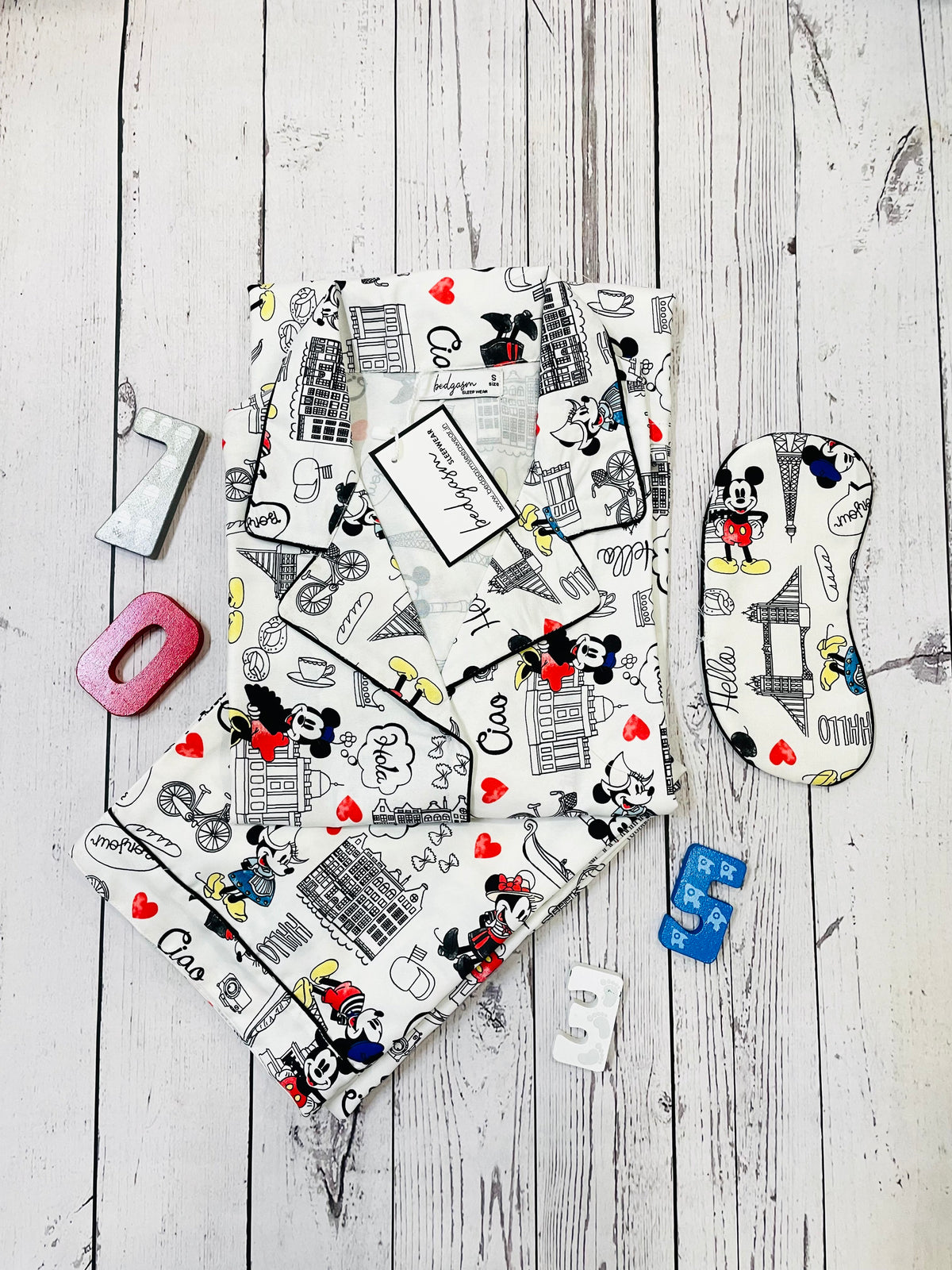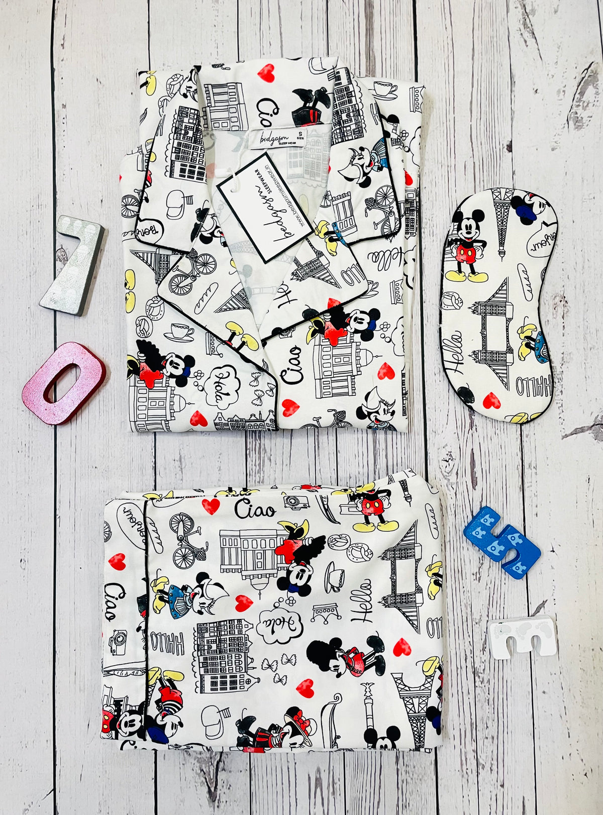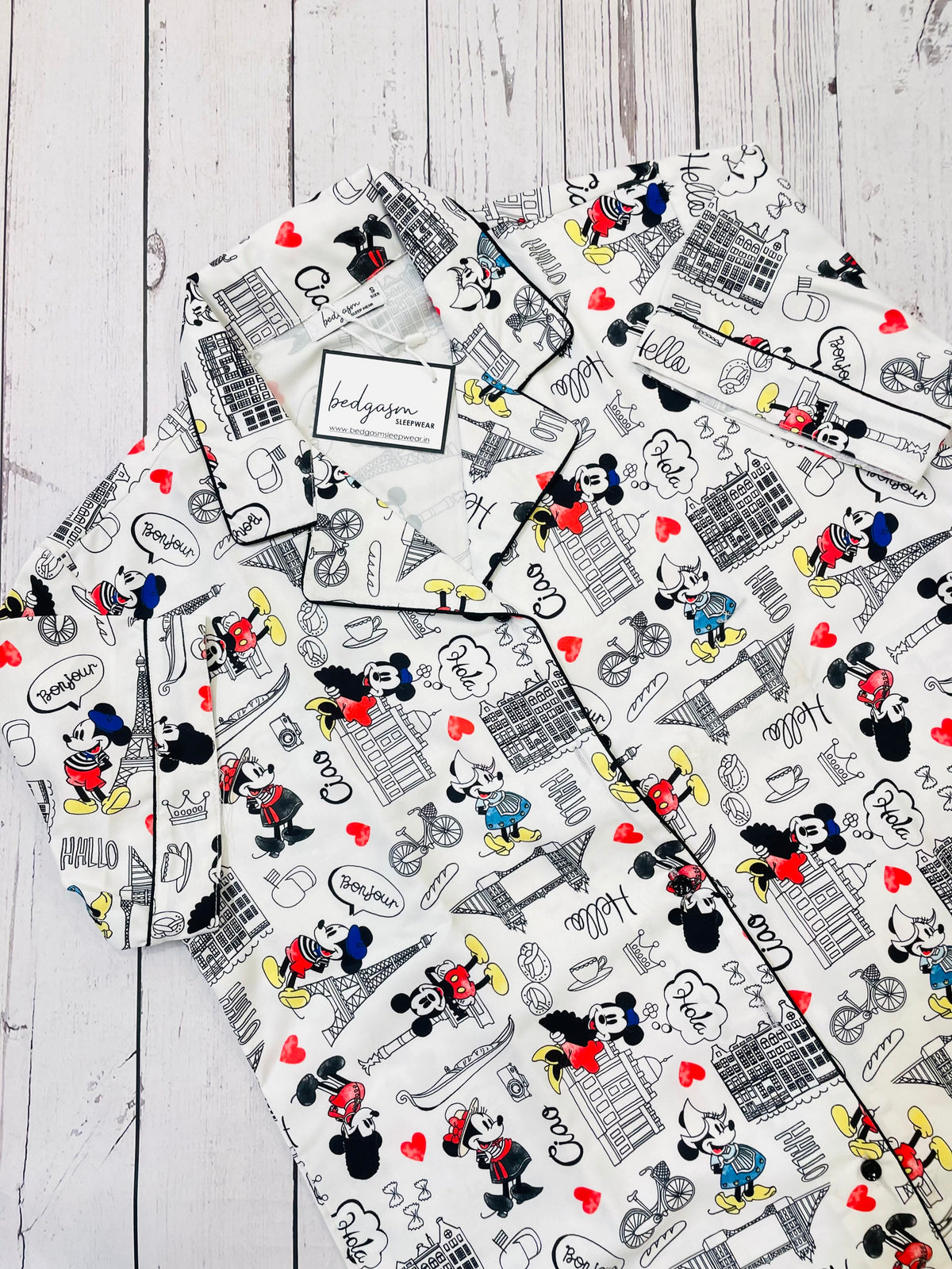 Awash in the crisp elegance of a monochrome palette, the pajamas are brought to life with playful splashes of red and yellow, evoking the vibrancy of Paris. Classic cartoon figures flirt with charming cityscapes, drawing you into a romantic narrative set against iconic landmarks like the Eiffel Tower. Each piece is adorned with heart motifs and friendly "Ciao" farewells, reminiscent of the city's renowned love stories and chic street cafes.