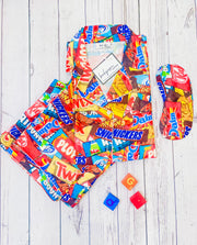 Step into a world of confectionery dreams with the "Chocolate Nightwear Set," crafted from the softest cotton blend that promises to cosset your skin in unparalleled comfort. This set is a kaleidoscope of color, a vibrant homage to the treats that sweeten our lives, featuring iconic chocolate wrappers that evoke the nostalgia of childhood and the thrill of a candy store visit.