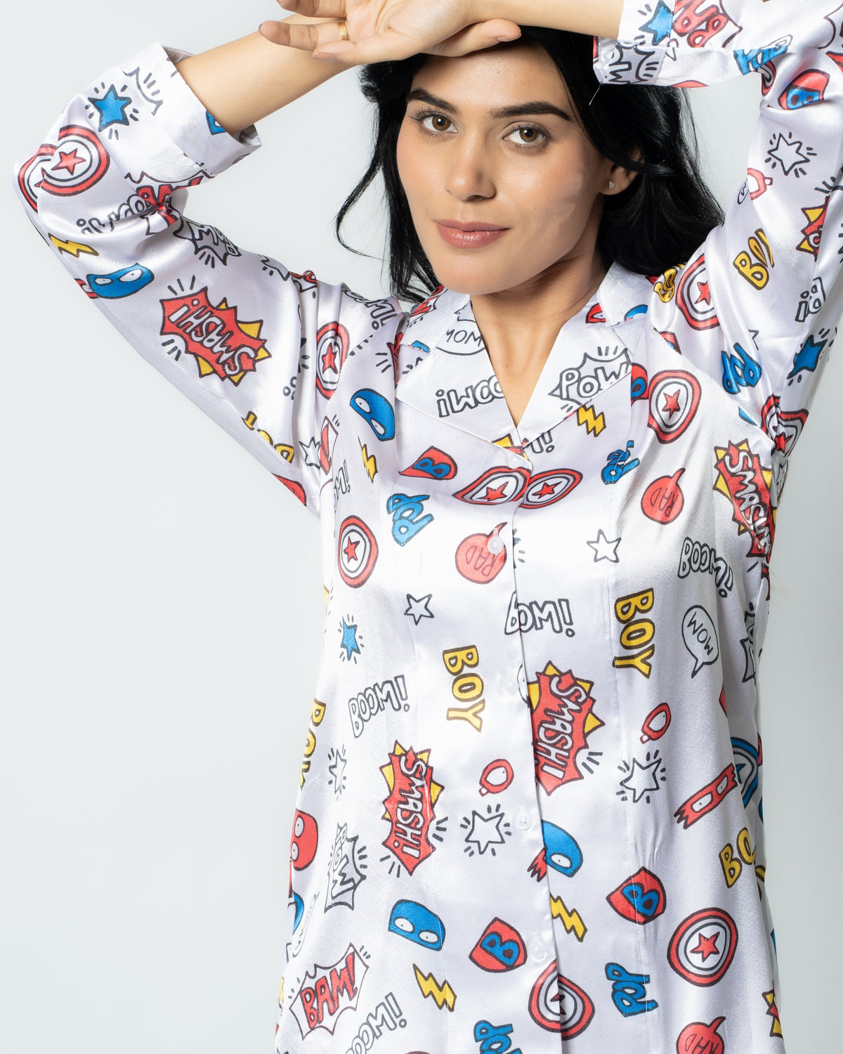 The silky-smooth fabric features a dazzling white base adorned with comic-style graphics in bold reds, blues, and yellows. Add a dash of superhero energy to your look, making you feel invincible even during your most relaxing moments. The button-down top and easy-fit pants are designed for effortless movement, blending style with practicality.